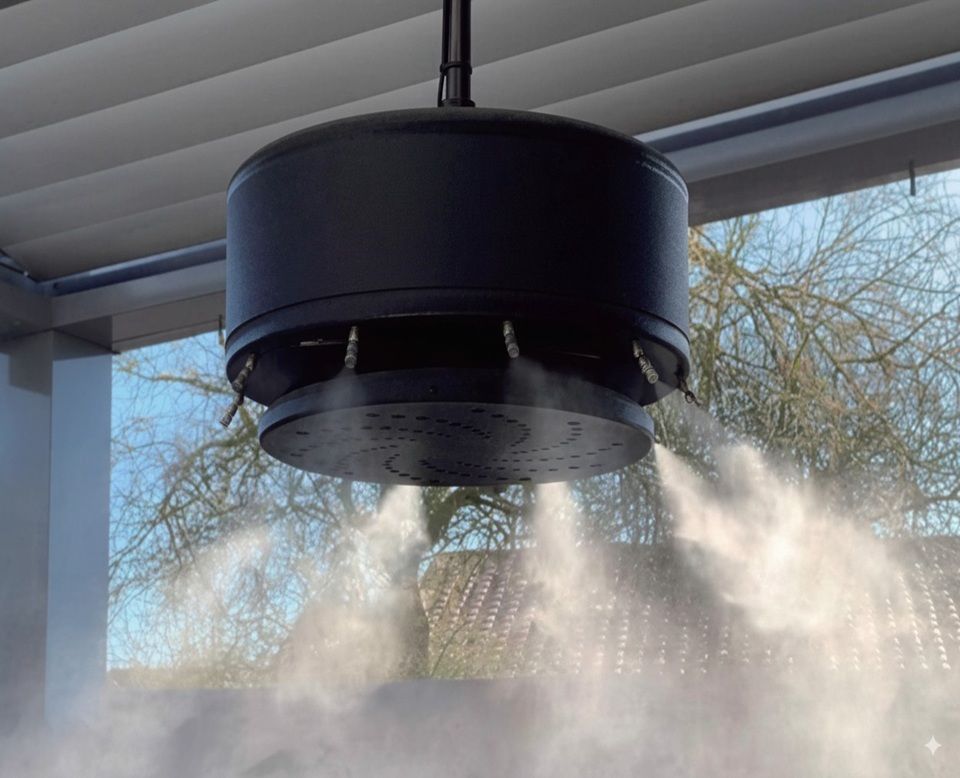 The LuxMist uses a high-pressure integrated misting ring with ultra-fine nozzles. Water is atomised into microscopic droplets, which evaporate instantly to cool the air—without wet floors or furniture.